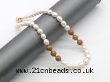 Details: Fashion pearl necklace: 16 - 24 inches 9mm - 10mm rice white freshwater pearls & 10mm round wooden jasper beaded necklace finished with copper spring ring clasp Item: CFN356 Material: 9-10mm rice white freshwater pearls 10mm round wooden jasper beads 1.5*4mm copper spacers (No.2) 11mm copper spring ring clasp (you can choose different spacer & clasp, if you like sterling silver clasp, other clasp or better quality rice white freshwater pearls we don't show, please contact us before you placing order) Color: See image Style: No.1: Non-knotted (Default) No.2: Hand-knotted Length (inch): Approx 16 inch (16-17”, Default) You can choose 17”(17-18”); 18”(18-19”); 19”(19-20”); 20”(20-21”); 22”(22-23”) or 24”(24-25”)