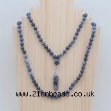Details: Hand-knotted sodalite mala necklaces: 108 6mm round sodalite beads with 1 10mm guru bead and sodalite pendant (you can choose different pendants) Item: GMN1632 Material: sodalite & sodalite pendant Color: See image Length (inch): Necklace length: approx 28 - 31 inches(Not including guru bead & pendant) Pendants: approx 12*38mm - 12*40mm Quantity Discount Pricing: 1 – 4: None 5 – 49: 95% 50 – 99: 90% 100+: 85% The listed price is for 1 piece necklace