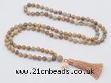 Hand-knotted jasper mala necklaces: 108 8mm/10mm round picture jasper beads with 1 12mm guru bead and satin tassel & alloy charm (you can choose different tassels & charms)