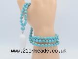 Details: Hand-knotted turquoise mala necklaces: 108 8mm/10mm round blue howlite beads with agate pendant/12mm guru bead and agate pendant (you can choose different pendants, but there will be tiny different in shape & color, we will make the jewelry randomly according to our stock) Item: GMN4044 Material: No.1: 8mm: 108 8mm blue howlite beads & agate pendant 10mm: 108 10mm blue howlite beads & agate pendant No.2: 8mm: 108 8mm white howlite beads, 12mm guru bead & agate pendant 10mm: 108 10mm white howlite beads, 12mm guru bead & agate pendant Color: See image Length (inch): Necklace length: 8mm: approx 37 - 40 inches (Not including guru bead & pendant) 10mm: approx 46 - 50 inches (Not including guru bead & pendant) Pendants: approx 18*50mm – 25*60mm Quantity Discount Pricing: 1 – 4: None 5 – 49: 95% 50 – 99: 90% 100+: 85% This mala is available in both 8mm and 10mm beads, The listed price is for 1 piece 8mm mala necklace