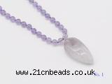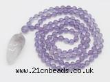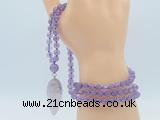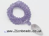 Details: Hand-knotted amethyst mala necklaces: 108 8mm/10mm round amethyst beads with amethyst pendant/12mm guru bead and amethyst pendant (you can choose different pendants, but there will be tiny different in shape & color, we will make the jewelry randomly according to our stock) Item: GMN4053 Material: No.1: 8mm: 108 8mm amethyst beads & amethyst pendant 10mm: 108 10mm amethyst beads & amethyst pendant No.2: 8mm: 108 8mm amethyst beads, 12mm guru bead & amethyst pendant 10mm: 108 10mm amethyst beads, 12mm guru bead & amethyst pendant Color: See image Length (inch): Necklace length: 8mm: approx 37 - 40 inches (Not including guru bead & pendant) 10mm: approx 46 - 50 inches (Not including guru bead & pendant) Pendants: approx 18*50mm - 25*60mm Quantity Discount Pricing: 1 – 4: None 5 – 49: 95% 50 – 99: 90% 100+: 85% This mala is available in both 8mm and 10mm beads, The listed price is for 1 piece 8mm mala necklace