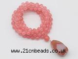 10mm: 108 10mm cherry quartz beads, 12mm guru bead & agate pendant