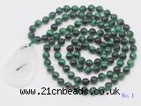 Details: Hand-knotted tiger eye mala necklaces: 108 8mm/10mm round green tiger eye beads with black rutilated quartz pendant/12mm guru bead and black rutilated quartz pendant (you can choose different pendants, but there will be tiny different in shape & color, we will make the jewelry randomly according to our stock) Item: GMN5096 Material: No.1: 8mm: 108 8mm blue tiger eye beads & black rutilated quartz pendant 10mm: 108 10mm blue tiger eye beads & black rutilated quartz pendant No.2: 8mm: 108 8mm blue tiger eye beads, 12mm guru bead & black rutilated quartz pendant 10mm: 108 10mm blue tiger eye beads, 12mm guru bead & black rutilated quartz pendant Color: See image Length (inch): Necklace length: 8mm: approx 37 - 40 inches (Not including guru bead & pendant) 10mm: approx 46 - 50 inches (Not including guru bead & pendant) Quantity Discount Pricing: 1 - 4: None 5 - 49: 95% 50 - 99: 90% 100+: 85% This mala is available in both 8mm and 10mm beads, The listed price is for 1 piece 8mm mala necklace