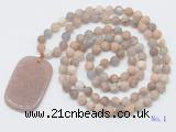 Details: Hand-knotted sunstone mala necklaces: 108 8mm/10mm round matte sunstone beads with strawberry quartz pendant/12mm guru bead and strawberry quartz pendant (you can choose different pendants, but there will be tiny different in shape & color, we will make the jewelry randomly according to our stock) Item: GMN5133 Material: No.1: 8mm: 108 8mm matte sunstone beads & strawberry quartz pendant 10mm: 108 10mm matte sunstone beads & strawberry quartz pendant No.2: 8mm: 108 8mm matte sunstone beads, 12mm guru bead & strawberry quartz pendant 10mm: 108 10mm matte sunstone beads, 12mm guru bead & strawberry quartz pendant Color: See image Length (inch): Necklace length: 8mm: approx 37 - 40 inches (Not including guru bead & pendant) 10mm: approx 46 - 50 inches (Not including guru bead & pendant) Quantity Discount Pricing: 1 – 4: None 5 – 49: 95% 50 – 99: 90% 100+: 85% This mala is available in both 8mm and 10mm beads, The listed price is for 1 piece 8mm mala necklace