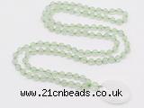 Details: Hand-knotted prehnite mala necklaces: 108 8mm/10mm round grade AA prehnite beads with white crystal pendant/12mm guru bead and white crystal pendant (you can choose different pendants, but there will be tiny different in shape & color, we will make the jewelry randomly according to our stock) Item: GMN5146 Material: No.1: 8mm: 108 8mm prehnite beads & blue chalcedony pendant 10mm: 108 10mm prehnite beads & blue chalcedony pendant No.2: 8mm: 108 8mm prehnite beads, 12mm guru bead & blue chalcedony pendant 10mm: 108 10mm prehnite beads, 12mm guru bead & blue chalcedony pendant Color: See image Length (inch): Necklace length: 8mm: approx 37 - 40 inches (Not including guru bead & pendant) 10mm: approx 46 - 50 inches (Not including guru bead & pendant) Pendants: approx 30*40mm Quantity Discount Pricing: 1 - 4: None 5 - 49: 95% 50 - 99: 90% 100+: 85% This mala is available in both 8mm and 10mm beads, The listed price is for 1 piece 8mm mala necklace