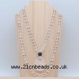 10mm: 108 10mm white crystal beads, 12mm black agate guru bead & white crystal pendant